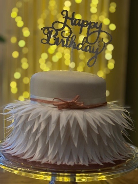 First cake of the year! A vanilla sponge with Betty’s strawberry jam and vanilla buttercream filling, covered in soft white fondant and edible rice paper feathers…